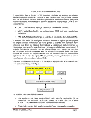 El documento habla sobre el Common Warehouse MetaModel (CWM), un estándar que permite el intercambio de metadatos de almacenes y business intelligence entre herramientas. CWM se basa en UML, MOF y XMI. XMI es un estándar para intercambiar metamodelos usando XML, permitiendo compartir modelos de objetos entre aplicaciones distribuidas. La OMG (Object Management Group) es una organización que promueve estándares para la interoperabilidad de software basado en objetos.