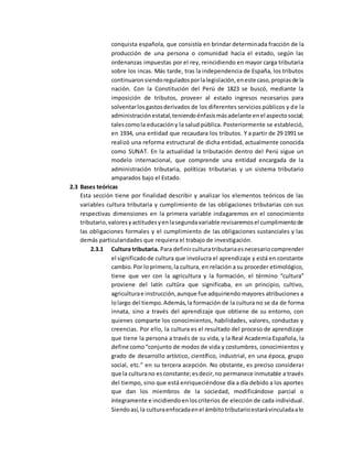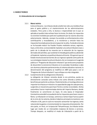 El documento presenta el marco teórico de una investigación sobre la cultura tributaria y el cumplimiento de las obligaciones tributarias. Define la cultura tributaria como la integración de conocimientos, valores y actitudes respecto a la tributación. Explica que la cultura tributaria incluye tres dimensiones: conocimiento tributario, valores tributarios y actitudes tributarias. También define las obligaciones tributarias formales como requisitos para el cumplimiento de la obligación tributaria principal, que es la obligación sustancial de pagar los tributos.