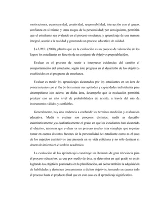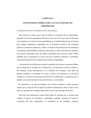 El documento describe las conceptualizaciones teóricas de la evaluación de los aprendizajes. Explica que la evaluación es un proceso de recopilación de información sobre el progreso de los estudiantes para que los docentes puedan tomar decisiones. También discute los antecedentes históricos de la evaluación, incluidos los modelos psicométricos y conductuales, y las características de la evaluación como un proceso continuo, integral y cooperativo.