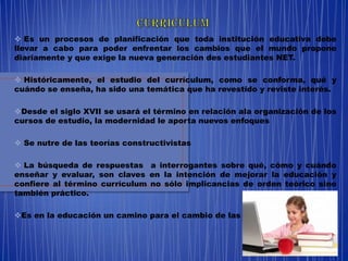 El documento discute el currículum y su importancia para enfrentar los cambios que propone el mundo moderno. Explica que el currículum debe ser un proceso de planificación flexible para atender las necesidades de los estudiantes y la sociedad. También destaca la importancia de repensar las prácticas docentes y los modelos de diseño curricular para adaptarse a las nuevas generaciones de estudiantes.
