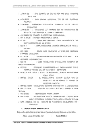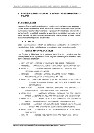 Este documento establece las especificaciones técnicas para el suministro de materiales y equipos para proyectos de distribución eléctrica en la región de Urubamba, Perú. Describe los requisitos de calidad, pruebas, embalaje, almacenamiento, garantías y normas aplicables para postes, conductores, aisladores y otros equipos. También especifica la documentación técnica requerida para cada material y las condiciones ambientales donde serán instalados.