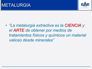 Este documento trata sobre los procesos de molienda y clasificación en metalurgia. Explica los conceptos básicos de la conminución y los diferentes tipos de equipos utilizados como molinos y chancadores. También describe parámetros clave de la molienda como el consumo de energía, razón de reducción y nivel de bolas, así como los revestimientos y la trayectoria del material dentro de los molinos. Finalmente, introduce la clasificación y los equipos empleados como hidrociclones y trommels.
