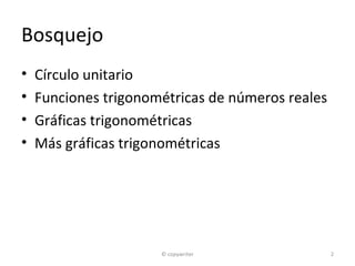 Este documento presenta conceptos sobre el círculo unitario y las funciones trigonométricas de números reales. Introduce el círculo unitario como el conjunto de puntos a una distancia de 1 del origen y muestra ejemplos de puntos en este círculo. Luego define las seis funciones trigonométricas (seno, coseno, tangente, cotangente, cosecante y secante) en términos de puntos en el círculo unitario determinados por números reales. Finalmente, discute propiedades como las funciones pares