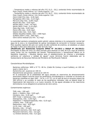 El documento establece los parámetros y características que debe cumplir el agua potable de suministro público y de uso domiciliario en Argentina. Define el agua potable y detalla sus características físicas, químicas y microbiológicas, incluyendo límites máximos permisibles para diversas sustancias. También establece los requisitos para el agua envasada, los tratamientos permitidos y sus características.