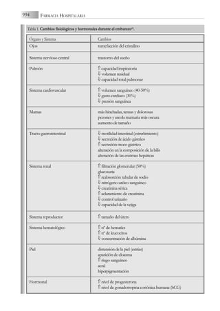 Este documento describe los cambios fisiológicos y hormonales que ocurren durante el embarazo y cómo esto puede afectar la farmacocinética y farmacodinamia de los fármacos. También explica cómo los fármacos pasan a través de la placenta y los factores que influyen en esta transferencia, así como la clasificación de los fármacos según su teratogenicidad y seguridad durante la lactancia.
