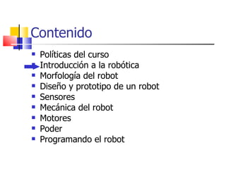 Este documento presenta una introducción a la robótica. Explica los antecedentes históricos de la robótica desde la antigua Grecia hasta el siglo XX cuando se acuñó el término "robot". También describe el origen y desarrollo de la robótica, incluyendo los primeros telemanipuladores y robots industriales. Define un robot industrial como una máquina de manipulación automática, reprogramable y multifuncional con tres o más ejes, y un robot móvil como uno que puede moverse. Ambos tipos de robots comparten característic