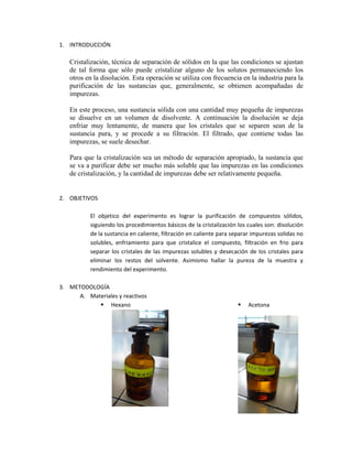 El documento describe el proceso de cristalización de acetanilida, destacando la importancia de seleccionar el solvente adecuado y los pasos de purificación, que incluyen disolución, filtración, enfriamiento y secado. Se identifica el agua como el mejor solvente por su capacidad de eliminar impurezas y bajo costo de eliminación. Finalmente, se obtuvieron 1g de ácido benzoico de una muestra original de 5g, lo que refleja un porcentaje de pureza del 40%.