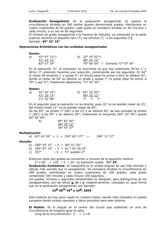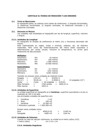 Este documento describe los tipos de mediciones, unidades de medida, errores y redondeo de números en topografía. Explica las unidades de longitud, superficie y ángulo utilizadas, así como las diferentes graduaciones angulares como sexagesimal, centesimal y radianes. Además, define los tipos de errores como naturales, instrumentales y humanos, y clasifica los errores en sistemáticos y accidentales. Finalmente, detalla el proceso de redondeo de números a diferentes grados de exactitud.
