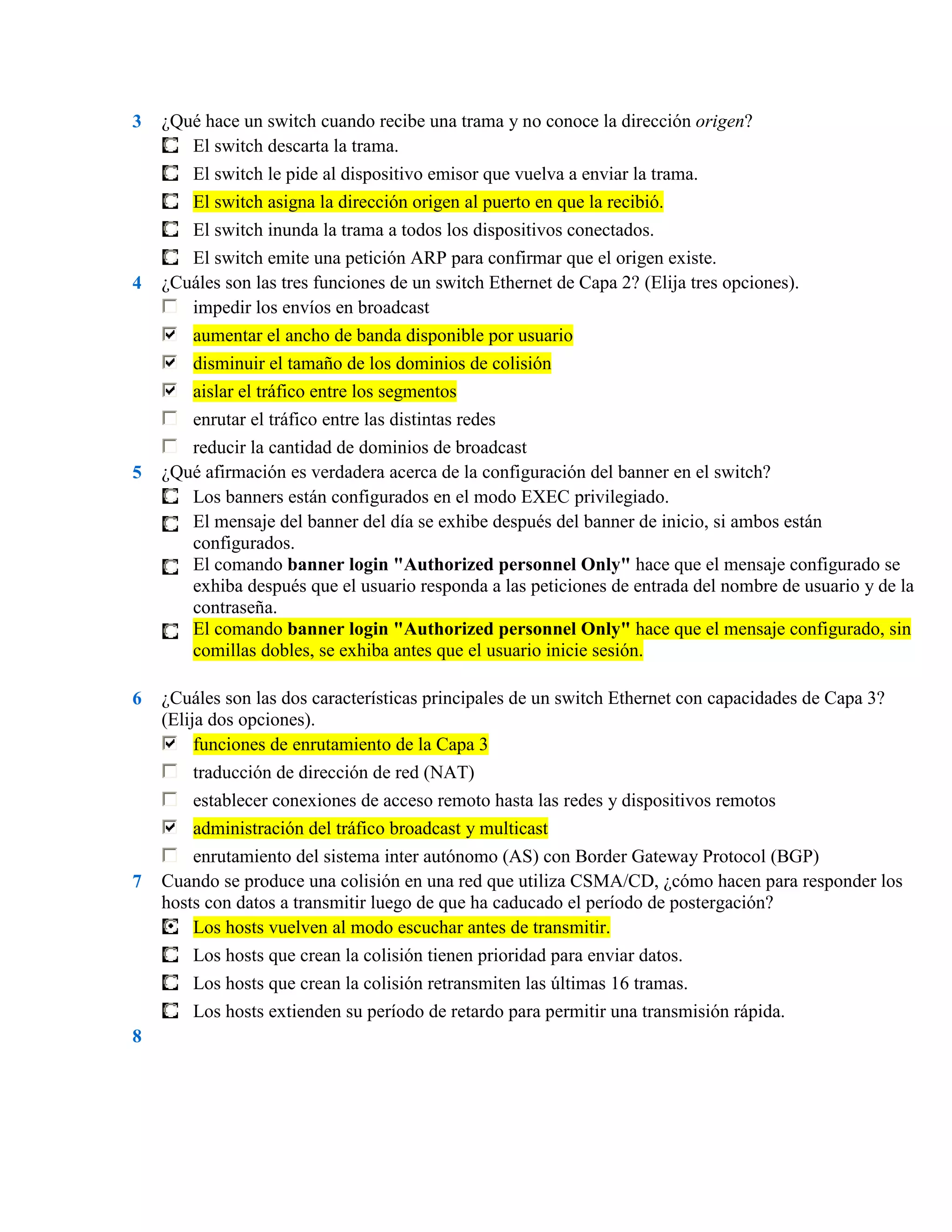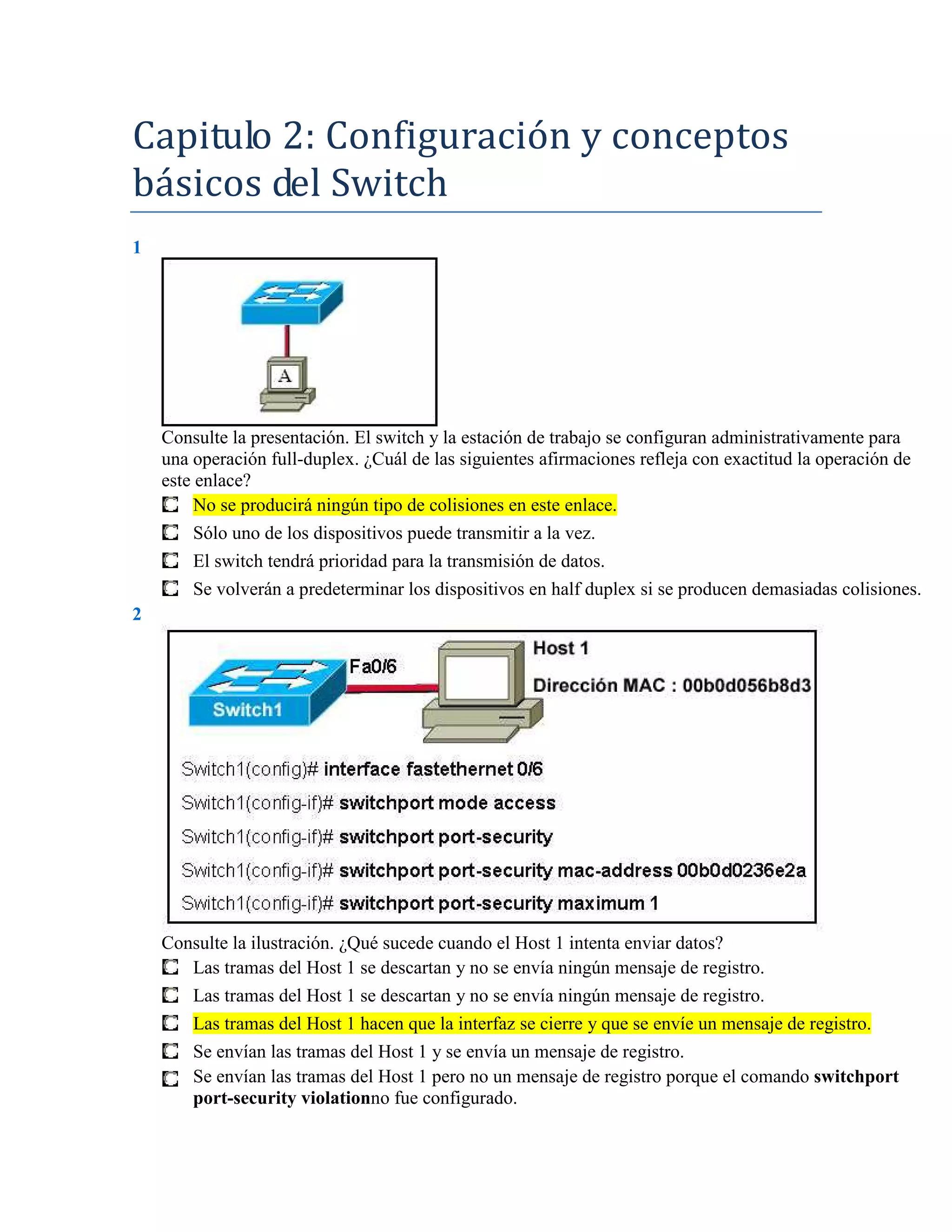 Este documento contiene preguntas y respuestas sobre conceptos básicos de switches. Explica cómo funcionan los switches al recibir tramas, cómo aprenden y almacenan direcciones MAC, y cómo se configuran parámetros como contraseñas, puertos seguros y acceso remoto.