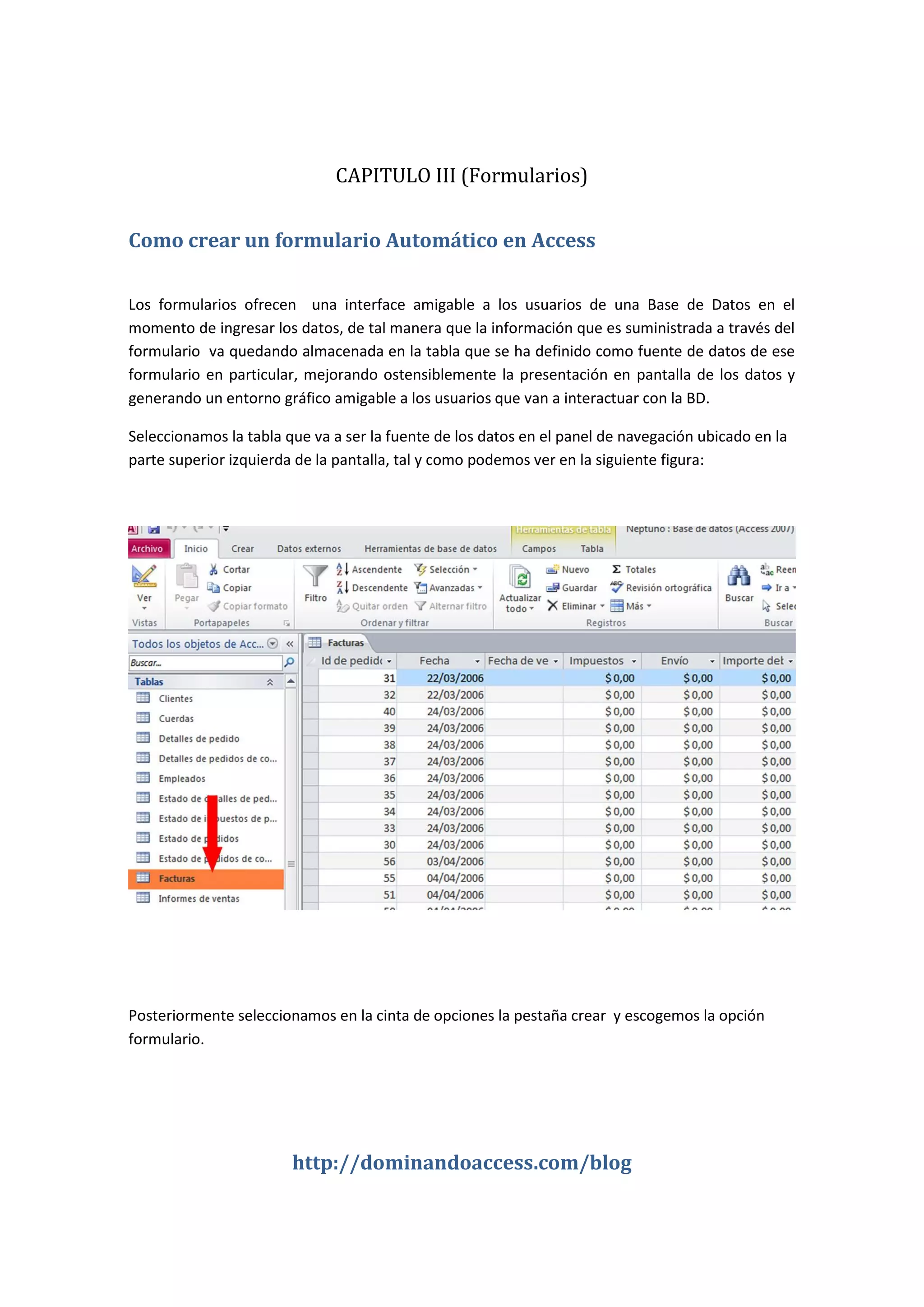 El documento explica cómo crear un formulario automático en Access que proporcione una interfaz amigable para los usuarios para ingresar y modificar datos de una tabla. Se selecciona primero la tabla de origen de datos, luego se crea un nuevo formulario vinculado a esa tabla para permitir la entrada, edición y eliminación de registros a través de una interfaz gráfica en lugar de directamente en la tabla. El formulario generado automáticamente enlaza los campos del formulario con los campos de la tabla subyacente.