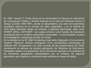 Los Sistemas de Información Geográfica tienen sus orígenes en las pinturas rupestres de hace 15.000 años que asociaban imágenes de animales con trazas lineales que representaban rutas de migración. En 1854, el Dr. John Snow mapeó casos de cólera en Londres, proporcionando otro ejemplo temprano. En 1964, Howard T. Fisher estableció el Laboratorio de Computación Gráfica y Análisis Espacial en Harvard, donde desarrolló conceptos clave para el manejo de datos espaciales. En la década de 1980,