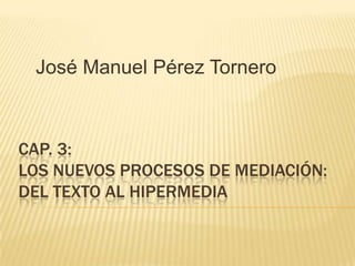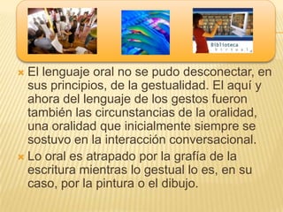 Este documento discute los cambios en los procesos de mediación del lenguaje desde la oralidad hasta los nuevos medios digitales e hipermedia. Argumenta que la escritura fue originalmente la forma más importante de mediación del lenguaje oral, pero que ahora los nuevos medios icónicos como la fotografía, el video y la digitalización están ganando importancia. También sugiere que la educación debe ampliar su enfoque en el lenguaje para incorporar diferentes semióticas y procesos de mediación, más allá de lo escrito/textual.