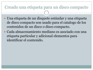 Este documento proporciona instrucciones sobre cómo crear etiquetas para discos compactos en Word 2007. Explica que las etiquetas se usan para catalogar el contenido de los discos y discos compactos y que Word 2007 ofrece varias opciones de vendedores de etiquetas. También define términos clave relacionados con diseño de páginas como placeholder, crop y bleed.