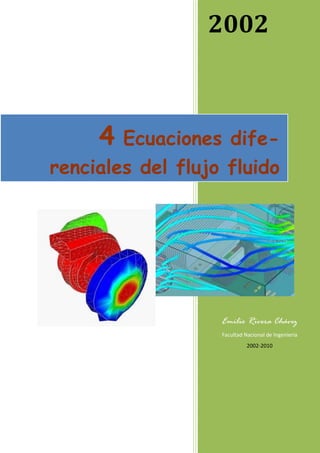 Este documento presenta las ecuaciones diferenciales que describen el flujo de fluidos. En la sección 4.2, se obtiene la ecuación diferencial de continuidad aplicando el teorema de Gauss a la ecuación integral de continuidad. En la sección 4.3, se explica que la ecuación diferencial de cantidad de movimiento se obtiene aplicando la segunda ley de Newton a un volumen de control elemental. Finalmente, la sección 4.6 presenta la ecuación diferencial de cantidad de movimiento resultante.