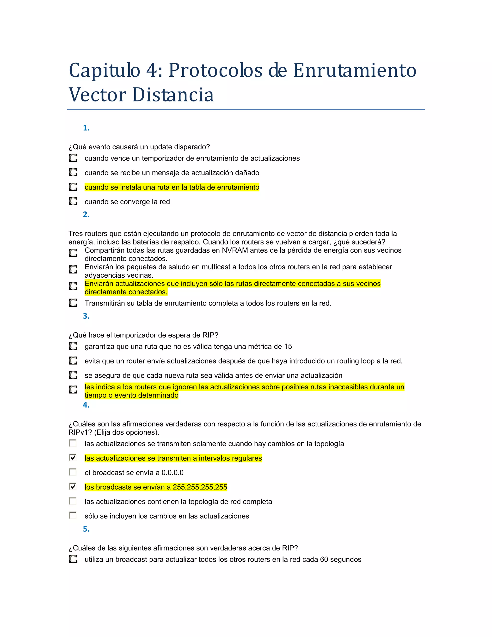 Este documento presenta 20 preguntas sobre protocolos de enrutamiento de vector de distancia como RIP y EIGRP. Las preguntas cubren temas como eventos que causan actualizaciones, comportamiento de routers después de una pérdida de energía, funciones de temporizadores, contenido de actualizaciones y más.