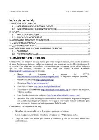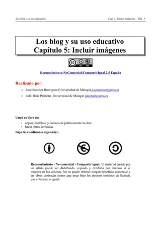Este documento proporciona instrucciones sobre cómo incluir imágenes en blogs utilizando Blogger y WordPress. Explica que las imágenes deben tener licencia Creative Commons para su uso y proporciona enlaces a repositorios de imágenes con esta licencia. A continuación, detalla los pasos para insertar imágenes en entradas de blog utilizando las herramientas de Blogger y WordPress. También brinda información sobre formatos de imagen y enlaces a ayuda para ambas plataformas.