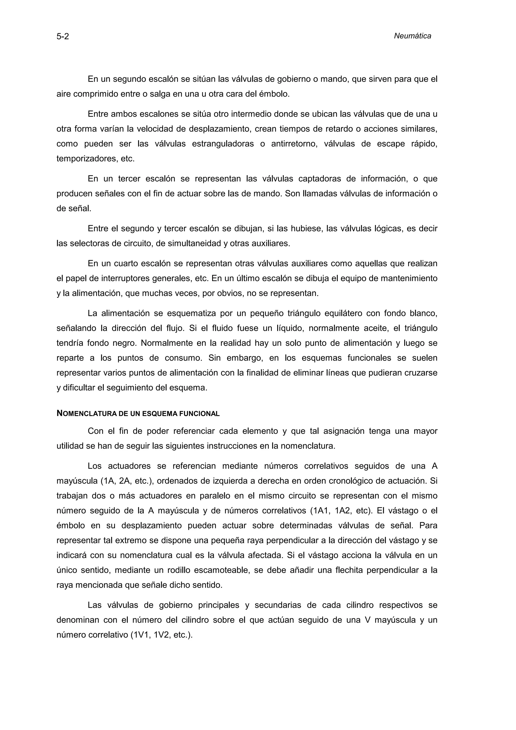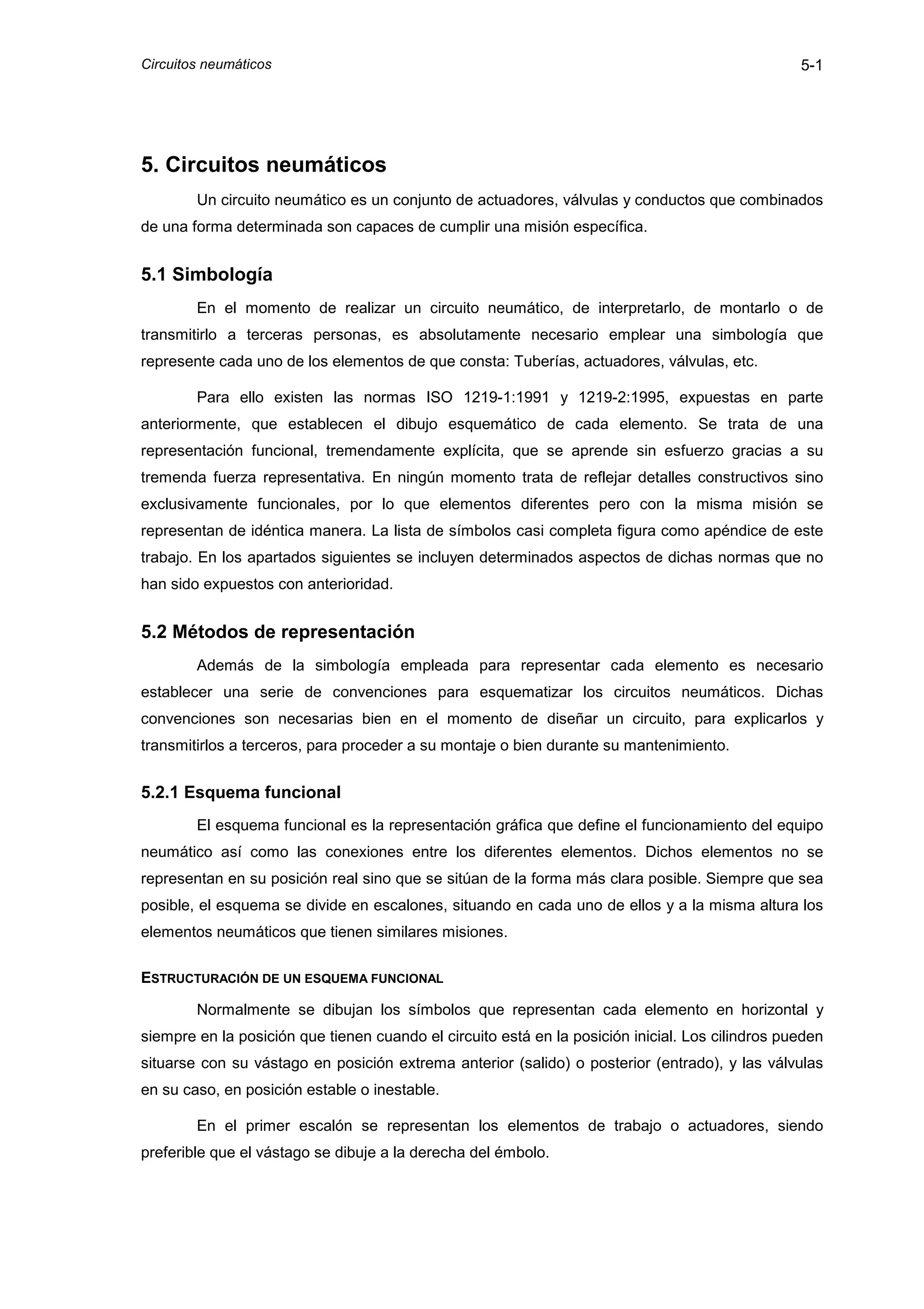 El documento describe los circuitos neumáticos, incluyendo su simbología, métodos de representación y nomenclatura. Un circuito neumático es un conjunto de elementos como actuadores, válvulas y tuberías que cumplen una misión específica. Se usan normas internacionales para representar cada elemento de forma funcional y no constructiva. Los esquemas funcionales muestran las conexiones entre elementos sin reflejar su posición real, y usan una nomenclatura estandarizada para referenciarlos.
