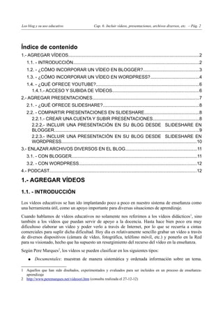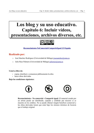 Este documento habla sobre cómo incluir diferentes tipos de contenido multimedia como vídeos, presentaciones y archivos en blogs educativos creados con Blogger y WordPress. Explica cómo agregar vídeos desde YouTube y cómo subirlos directamente, cómo compartir presentaciones desde SlideShare, y cómo enlazar archivos. También menciona las opciones que ofrece YouTube para subir y etiquetar vídeos.