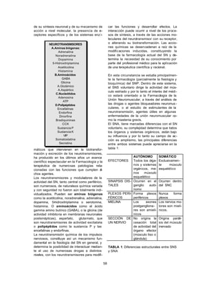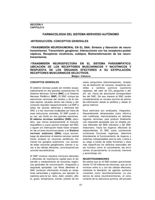 Este documento trata sobre la farmacología del sistema nervioso autónomo. Explica que el sistema nervioso autónomo regula funciones orgánicas esenciales como la respiración, la circulación, las secreciones glandulares y la actividad de los músculos lisos. Describe las dos divisiones principales del sistema nervioso autónomo: el simpático y el parasimpático. El simpático libera noradrenalina y adrenalina, mientras que el parasimpático libera acetilcolina. Finalmente, indica que el est