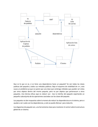 Un diagrama de paquetes muestra cómo un sistema está dividido en agrupaciones lógicas mostrando las dependencias entre ellas. Los paquetes permiten organizar los elementos de un modelo UML para facilitar el manejo de sistemas complejos, definiendo espacios de nombres y permitiendo la división de un modelo en unidades individuales. Los diagramas de paquetes son útiles para mantener el control sobre la estructura global de un sistema.