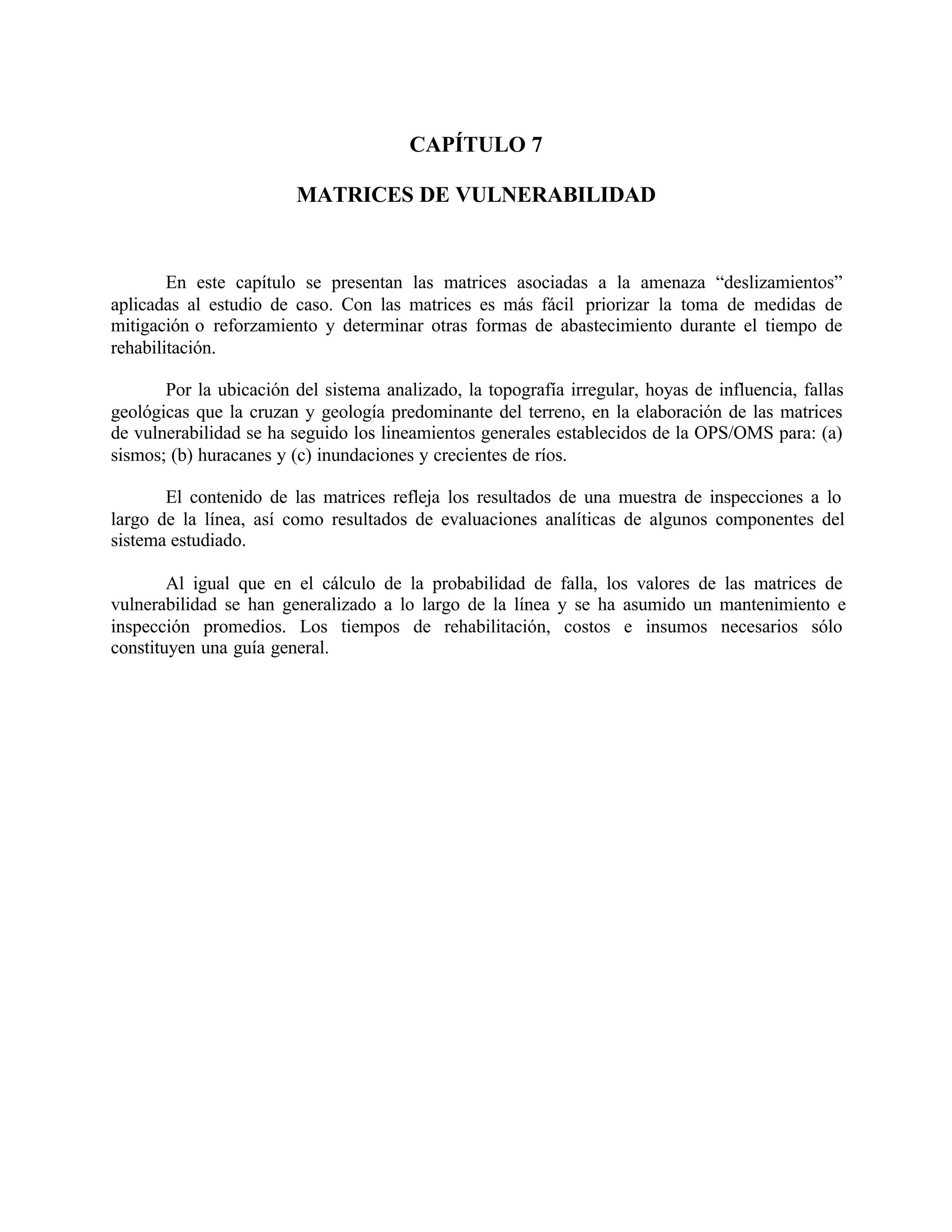 Este capítulo presenta matrices para evaluar la vulnerabilidad asociada con deslizamientos en el sistema de agua analizado. Las matrices facilitan priorizar medidas de mitigación y determinar alternativas durante la rehabilitación. Se elaboraron matrices de vulnerabilidad física, operativa y administrativa considerando deslizamientos por gravedad, lluvias torrenciales y sismos. Las matrices incluyen componentes expuestos, estado, daños potenciales, tiempos de reparación y áreas de impacto.