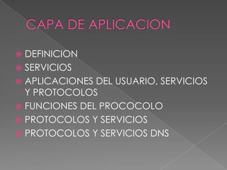 La capa de aplicación proporciona servicios como transferencia de archivos y correo electrónico a los procesos de aplicación. Identifica la disponibilidad de socios de comunicación y establece acuerdos sobre recuperación de errores. Los protocolos como DNS, HTTP y FTP especifican los formatos y procedimientos para el intercambio de datos entre aplicaciones.