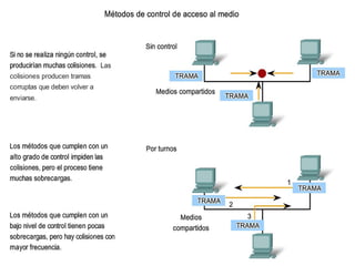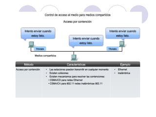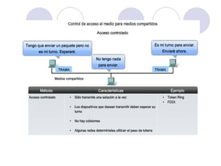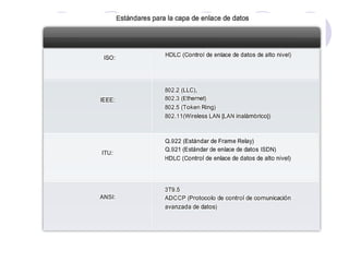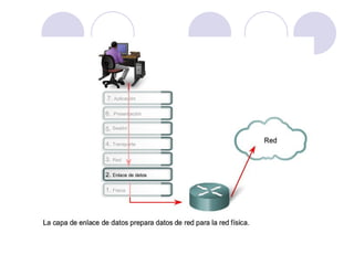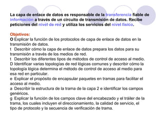 Este documento describe la función de la capa de enlace de datos en la transmisión de datos. La capa de enlace es responsable de la transferencia fiable de información a través de un circuito de transmisión de datos mediante la preparación de los datos para su transmisión a través de los medios de red y el uso de protocolos MAC y protocolos de enlace de datos para controlar el acceso al medio y detectar y corregir errores.