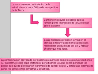 La capa de ozono se encuentra en la estratosfera a unos 30 km sobre la superficie terrestre y contiene moléculas de ozono que absorben la radiación ultravioleta del Sol para proteger la vida en la Tierra. La contaminación por clorofluorocarbonos y otros químicos destruye la capa de ozono, lo que perjudica la salud humana y los ecosistemas. En 1987, se firmó el Protocolo de Montreal para reducir el uso de estas sustancias y preservar la capa de ozono.