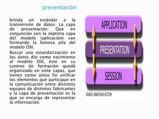 La capa de presentación del modelo OSI proporciona una estandarización en la transmisión de datos entre sistemas. Se encarga de representar la información de forma reconocible al ocuparse de los aspectos semánticos y sintácticos de la comunicación, como la compresión, cifrado y estructura de los datos. También puede implementar aplicaciones de criptografía.