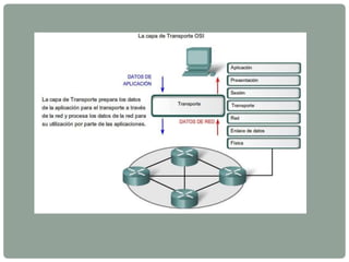 La capa de transporte prepara los datos para la transmisión a través de la red y procesa los datos de red para su uso por las aplicaciones. El protocolo UDP es no orientado a conexión y transfiere datos sin confirmación, mientras que el protocolo TCP es orientado a conexión y confirma la recepción de datos a través del control CRC.