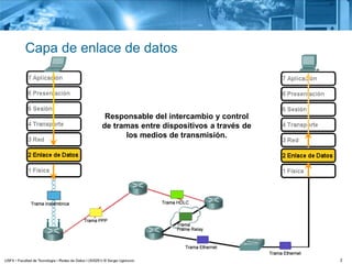 La capa de enlace de datos es responsable del intercambio de tramas entre dispositivos a través de los medios de red físicos. Encapsula la información de las capas superiores dentro de una trama y controla el acceso a los medios compartidos utilizando diferentes métodos como CSMA/CD o acceso controlado. Los dispositivos de red como las tarjetas de red y los switches operan en esta capa.