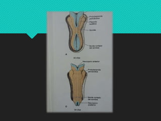 Este documento describe el desarrollo embrionario durante la tercera semana. La capa germinal ectodérmica forma un disco con la región cefálica más ancha. La notocorda y el mesodermo precordal inducen la formación de la placa neural que forma el neuroectodérmico. La regulación molecular de la inducción de la cresta neural depende de la interacción del ectodermo neural con el ectodermo superficial y los niveles de BMP, WNT y FGF.