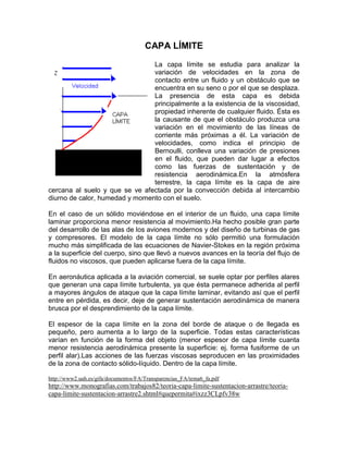 La capa límite se estudia para analizar la variación de velocidades en la zona de contacto entre un fluido y un obstáculo. La presencia de esta capa se debe a la viscosidad del fluido, que causa variaciones en el movimiento de las líneas de corriente cerca del obstáculo. El espesor de la capa límite afecta la resistencia aerodinámica y la generación de sustentación.