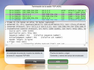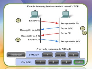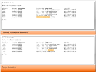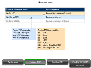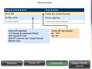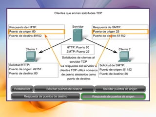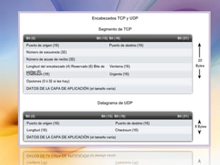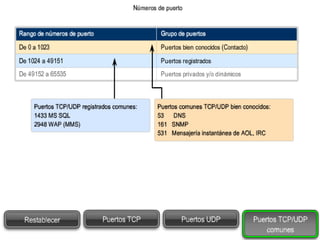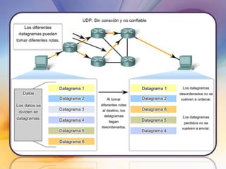 Las redes de datos e Internet brindan soporte a la comunicación entre personas a través de aplicaciones como correo electrónico, navegadores web y mensajería instantánea. Los protocolos de la capa de transporte como TCP y UDP dividen los datos de las aplicaciones en segmentos para su envío a través de la red y su reensamblaje en el destino. Cada aplicación se identifica mediante números de puertos únicos para mantener separadas las diferentes comunicaciones simultáneas.