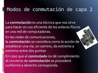 El documento describe diferentes modos de conmutación de capa 2 en redes de computadoras, incluyendo Store-and-forward switch, cut-through switch y fragment-free switch. Store-and-forward switch almacena cada trama en un búfer antes de reenviarla, lo que asegura la transmisión sin errores pero introduce demora. Cut-through switch y fragment-free switch minimizan la demora leyendo solo parte de la trama, pero pueden retransmitir tramas corruptas.