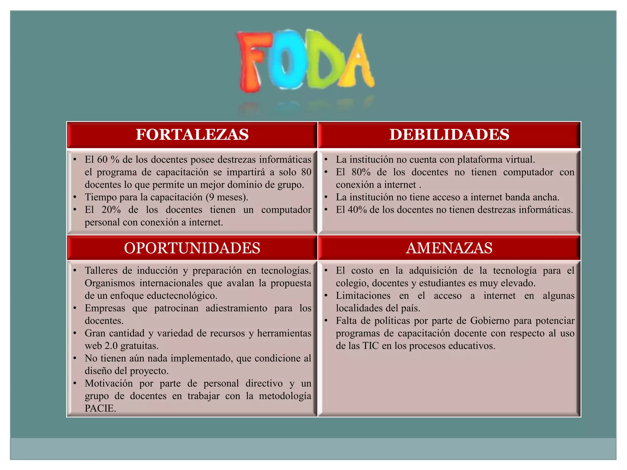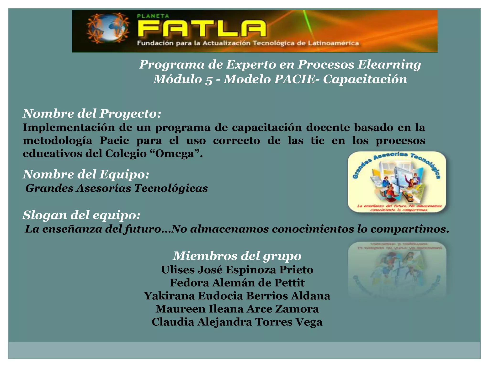 Este documento presenta una propuesta para capacitar a los docentes del Colegio Omega de Nicaragua en el uso de las TIC a través de la implementación de aulas virtuales basadas en la metodología PACIE. La propuesta consiste en nueve módulos de capacitación virtual durante nueve meses, utilizando la plataforma Educlic. La capacitación será impartida por expertos en e-learning y requiere que la institución provea computadoras e internet para los docentes. El objetivo es mejorar el uso de la tecnología en la enseñanza mediante