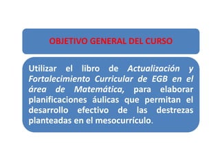 El documento aborda la actualización curricular de matemática para octavo a décimo años de educación general básica, enfocándose en la planificación de clases y la evaluación del desempeño estudiantil. Se enfatiza la importancia de las destrezas con criterios de desempeño y la utilidad de la matemática en la vida cotidiana. Incluye diversas actividades individuales y grupales para reflexionar sobre la enseñanza y el aprendizaje de la matemática.