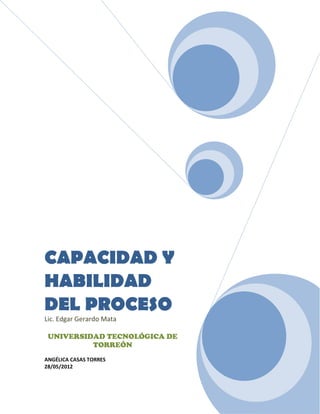 Este documento describe varias medidas de capacidad y rendimiento de procesos. La capacidad de proceso (Cp) compara la variabilidad del proceso con los límites de especificación, y debe ser mayor que 2.0 para un buen proceso. El índice de capacidad de proceso (Cpk) mide qué tan bien los datos se ajustan y centran entre los límites, y debe ser mayor que 1.5. El nivel de calidad sigma de un proceso indica su variabilidad y debe ser 6 sigma o más para menos de 3.4 defectos por millón.
