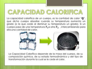 La capacidad calorífica de un cuerpo es la cantidad de calor necesaria para elevar su temperatura en 1 grado Celsius y depende de la masa, composición, estado y tipo de transformación del cuerpo. Se mide en julios por kelvin o calorías por grado Celsius y se calcula multiplicando la masa por el calor específico del material.