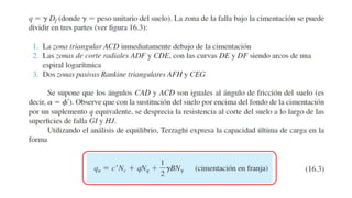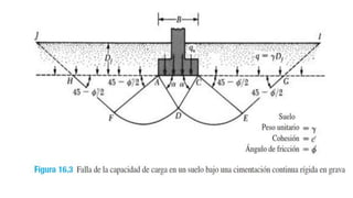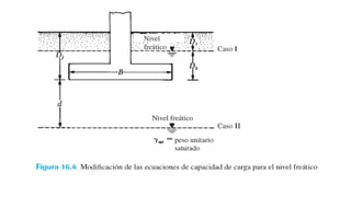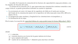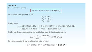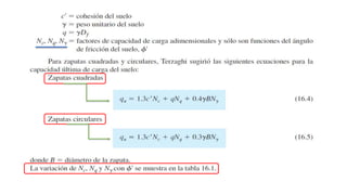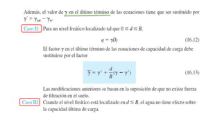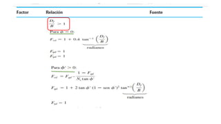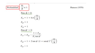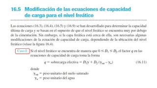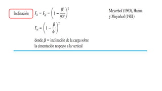 El documento habla sobre la capacidad de carga para cimentaciones. Explica los principales requerimientos y métodos para determinar la capacidad de carga, incluyendo la ecuación general de Meyerhof. También cubre factores de forma, la influencia del factor de seguridad en la capacidad de carga, y las teorías de Terzaghi y Meyerhof sobre este tema.