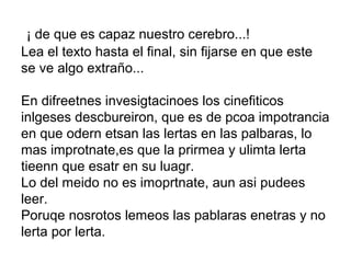 El documento presenta varios experimentos visuales que demuestran las capacidades asombrosas de nuestro cerebro. A pesar de que las letras en una palabra no estén en el orden correcto, podemos leerla fácilmente. También podemos distinguir entre figuras que giran y no giran a pesar de que nuestros ojos nos dicen lo contrario. Finalmente, después de mirar fijamente cuatro puntos en un dibujo y parpadear, podemos ver la ilusión de alguien en nuestros ojos.