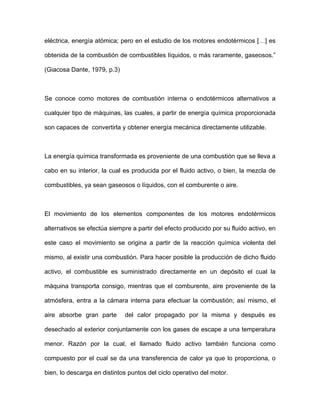 El documento describe los componentes y funcionamiento básico de los motores de combustión interna. Explica que estos motores convierten la energía química de los combustibles en energía mecánica a través de una reacción de combustión en el cilindro que hace mover el pistón. También describe los sistemas auxiliares de lubricación, refrigeración y suministro eléctrico necesarios para el funcionamiento del motor, así como la clasificación de los motores según su diseño y número de cilindros.