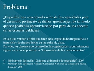 El documento define el concepto de capacidades y propone una secuencia lógica de tareas para el desarrollo de las mismas. Explica que una capacidad implica una serie de procedimientos que deben ser aprendidos de forma secuencial, desde lo más simple hasta lo más complejo. Asimismo, presenta diferentes modelos teóricos sobre el desarrollo de capacidades propuestos por autores como Pestalozzi, Luria, Bloom y otros. El objetivo es contribuir a la aplicación de las capacidades en las escuelas públicas.