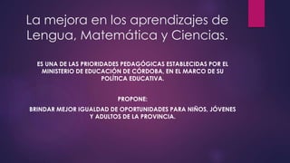 El documento presenta una propuesta educativa para mejorar los aprendizajes en lengua, matemática y ciencias, enfatizando la importancia de desarrollar capacidades fundamentales en los estudiantes. A través de estrategias de enseñanza y un enfoque inclusivo, se busca brindar igualdad de oportunidades en la educación y fomentar la autonomía, pensamiento crítico y habilidades de colaboración. Concluye que es responsabilidad del docente facilitar el aprendizaje y garantizar que todos los alumnos tengan la posibilidad de integrarse en el sistema educativo.