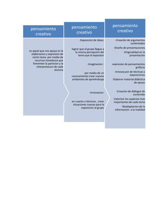 El documento describe diferentes habilidades y conceptos relacionados con el análisis y comprensión de obras de arte y culturas. Entre ellos se encuentran identificar elementos de corrientes artísticas, distinguir entre cultura y arte, categorizar elementos de una obra, analizar observando sus componentes y estructura, y argumentar ideas con razones. También se mencionan habilidades como la orientación espacio-temporal para ubicar culturas, y el pensamiento creativo para presentar temas de manera innovadora y original.