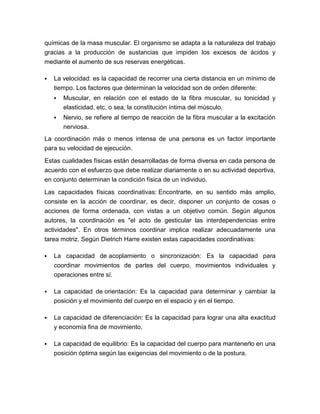 Este documento describe las capacidades físicas básicas como la flexibilidad, fuerza, resistencia y velocidad. También explica las vías metabólicas aeróbicas y anaeróbicas para producir energía muscular, incluyendo las características del metabolismo aeróbico y anaeróbico.