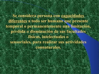 Este documento discute aspectos legales relacionados con la atención de personas con capacidades diferentes. Aborda temas como definiciones, obligaciones gubernamentales, objetivos, líneas de acción, normas y leyes que promueven la inclusión y protección de derechos de las personas con capacidades diferentes.