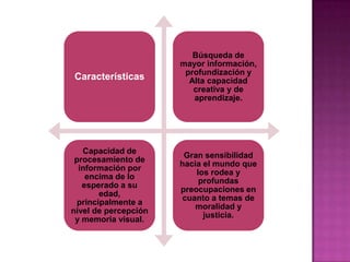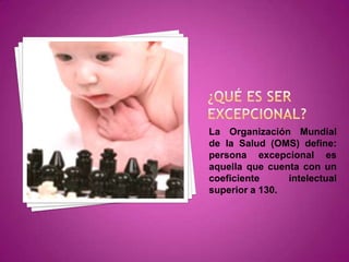 El documento define a una persona con capacidades excepcionales como aquella con un coeficiente intelectual superior a 130 según la OMS. Explica que la educación de estos niños debe ser interdisciplinaria e individualizada para brindarles desafíos acordes a sus capacidades, ya sea a través de aceleración curricular o enriquecimiento sin avanzar cursos.