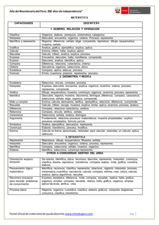Este documento presenta una lista de capacidades y desempeños en diferentes áreas como lenguaje, matemáticas, ciencias sociales, ciencias naturales y religión. Describe habilidades como identificar, describir, analizar, clasificar, comunicar, entre otras, y cómo estas se aplican en cada área de estudio. El propósito es proveer una taxonomía de capacidades y desempeños para orientar el desarrollo de materiales educativos.