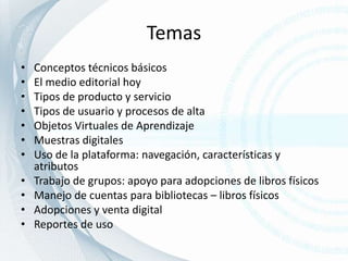 Este documento presenta los temas y conceptos técnicos de la Plataforma LibroWeb. Explica los tipos de productos y servicios que ofrece como libros digitales, objetos virtuales de aprendizaje y sistemas de gestión de contenidos y aprendizaje. También describe las características y funcionalidades que brinda a usuarios como estudiantes, docentes y bibliotecas para visualizar y interactuar con contenidos digitales.